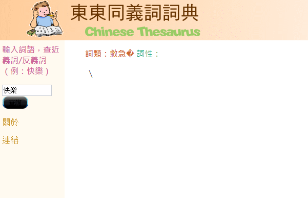 更新成4.0後以前看這個網頁(http://www.kwuntung.net/synonym/)然後在左邊的地方用查詢以後字都會變成亂碼(附圖)