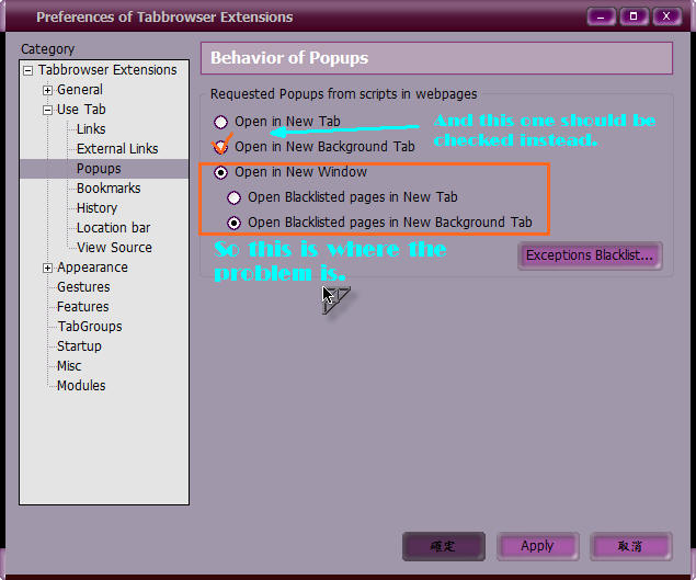 你真是福星一名!看了你說可能是設定的問題以後,我抱著姑且一試的心情打開TBE的設定視窗來看,四處找找有什麼設定上的問題,結果看到pop-up設定那一頁的時候,我就換了一個設定,結果就好了!路人乙兄,你是不是和我一樣設成這樣?照ghost兄說的,一點沒錯,設成開到分頁就對了,而我是設成開到視窗,黑名單的開到分頁,結果完全無效,javascript的pop-up就出不來了(對了,這樣還是可以叫pop-up嗎 :?: );換成開到分頁真的就可以了!看來可以去官網反映了,不然作者一定覺得奇怪「明明就可以的啊你們在抱怨什麼……」:P