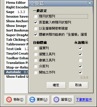 Autohide和你想的差不多,不過還更強就是了,可以選擇哪些toolbar要自動隱藏,哪些永遠顯示(所以比起Firefox內建的全螢幕強多多多多了……:P),所以我的網址列所在的那個工具列在全螢幕狀態下仍然是顯示著的。:)