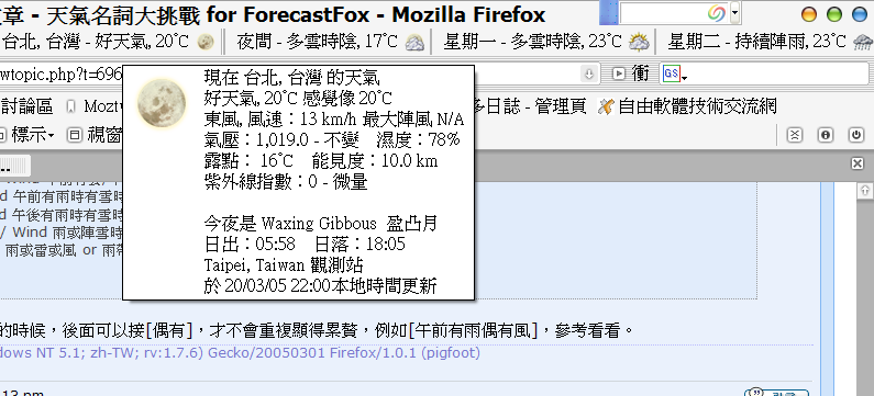 Mozilla/5.0 (Windows; U; Windows NT 5.1; zh-TW; rv:1.7.6) Gecko/20050301 Firefox/1.0.1 (pigfoot)