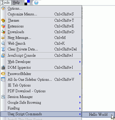 使用 GM_registerMenuCommand() 函數可以在Firefox的Tools->User Script Commands選單上加上自己的選單項目。