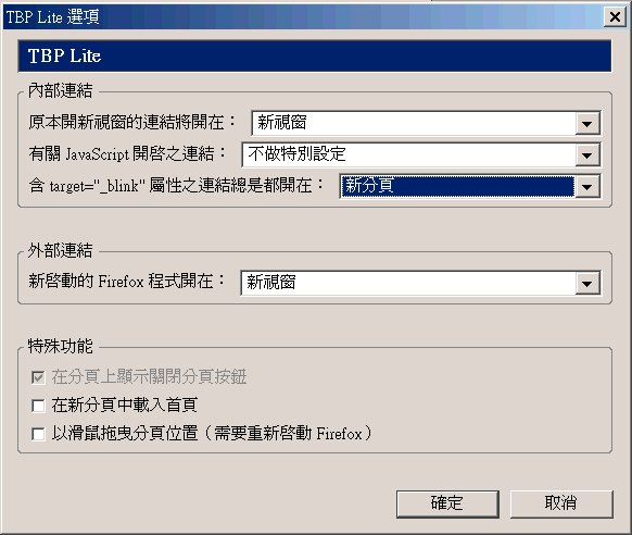 最後一點,Firefox 可強制新視窗開原先的分頁或新的分頁裏,但它沒有更細的設定,因此如果我希望 target="_blank" 這類的連結開在「目前分頁」,而 javascript 視窗開在「新分頁」,Firefox 就辦不到。但舊版 TBP 的程式碼卻提供了這個功能。