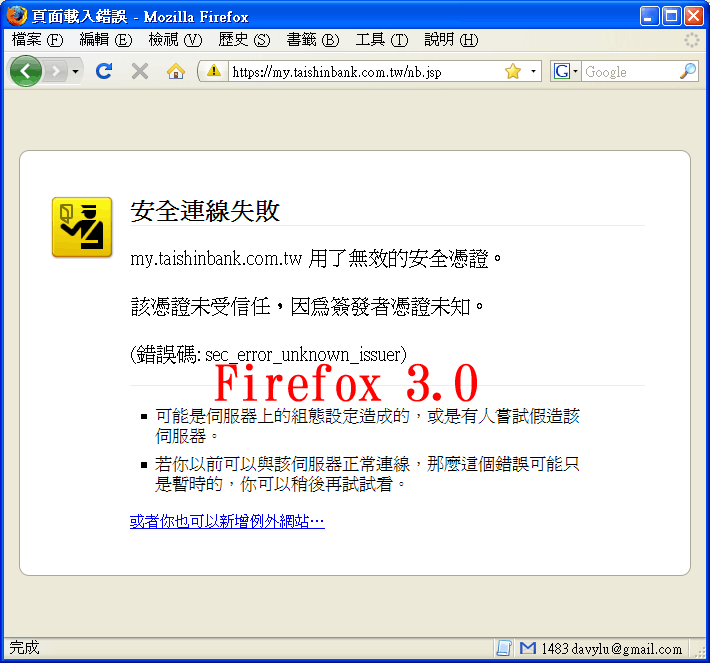 可是不知道什麼時候開始,我用 Firefox 2.0.0.14 瀏覽 台新銀行網銀的時候,一定會先跳出如下對話框《網站憑證由未知單位所提供》: