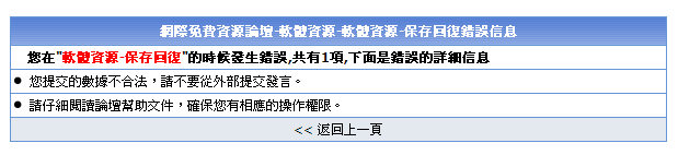 在這個論壇可以看貼正常 就是無法在論壇里發貼及回貼,安全模式也沒用 論壇︰www.webeee.com Powered By Dvbbs Version 7.1.0 Sp1 Copyright c2000 - 2005 Aspsky.Net