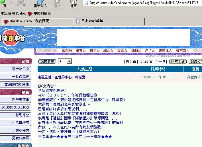 不好意思,我有先用搜尋去找,可是我找不到相關的問題,也可能是我輸入的索引字不對,所以找不到,不過我想這個問題應該可嘲在這裡提問吧!就是我在上緯x電視台的討論區時,所看的所有回覆的文章都會擠在最上面,請問是我自己firefox少裝什麼套件,還是緯x電視自己本身的問題呢?