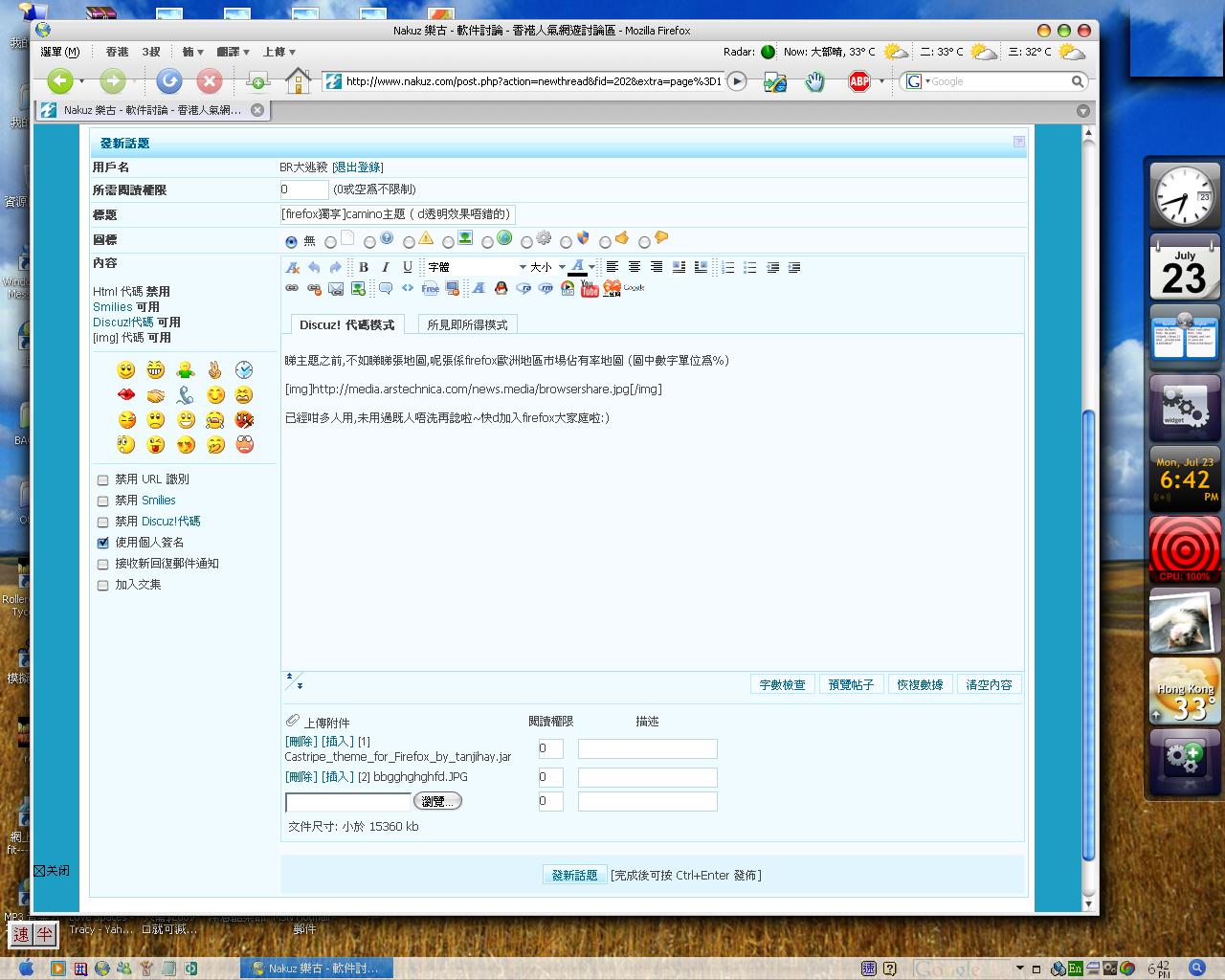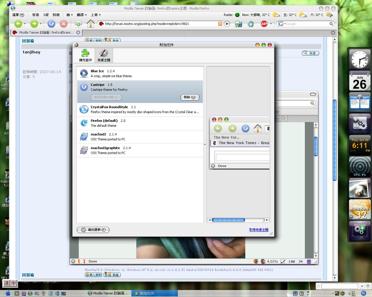 另外,myFireFox 的 kfly 兄有幫他查出他 theme 一些 bug 的解決方法,我有留言上去,可能表達不是很清楚,你可以順便跟他說說。