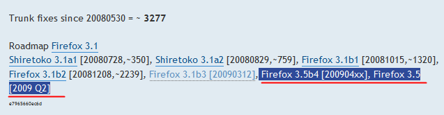 Shiretoko 3.1a1 [20080728,~350], Shiretoko 3.1a2 [20080829,~759], Firefox 3.1b1 [20081015,~1320], Firefox 3.1b2 [20081208,~2239], Firefox 3.1b3 [20090312], Firefox 3.5b4 [200904xx], Firefox 3.5 [2009 Q2]