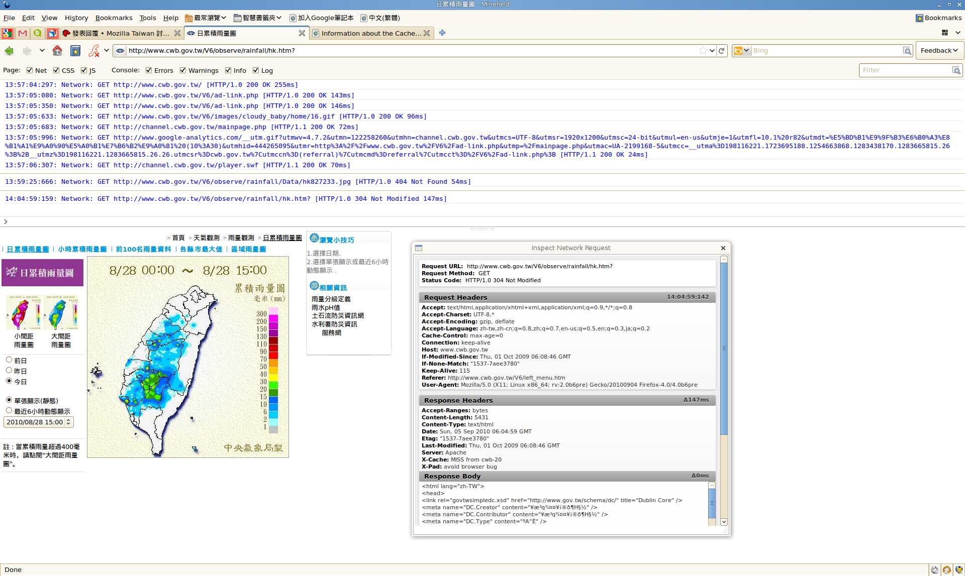 我現在用Firefox 4最近新增的Web console看載入這個網頁的問題,原本是想看瀏覽器發出的http request header和收到的http response header,但是發現切換到「雨量觀測」與「溫度分佈」這兩個Frame的時候,瀏覽器根本沒有送出網路請求,直接顯示cache的內容。