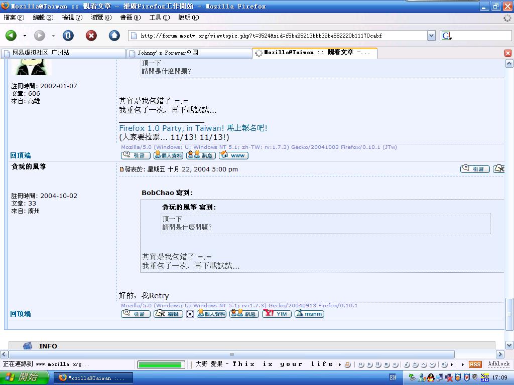 Mozilla/5.0 (Windows; U; Windows NT 5.1; zh-TW; rv:1.7.3) Gecko/20041003 Firefox/0.10.1 (JTw)