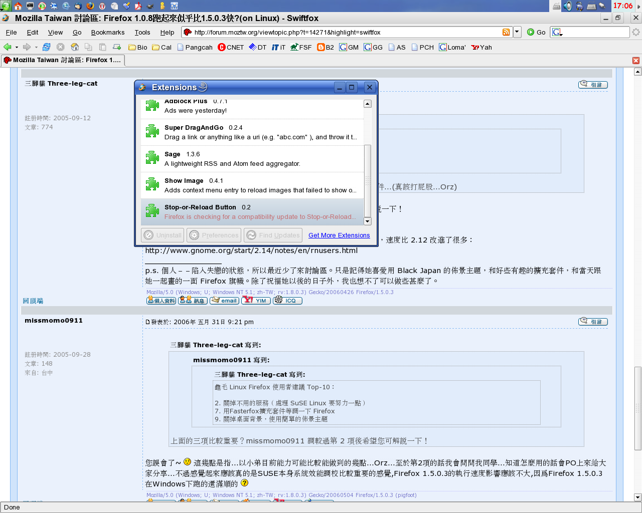 Mozilla/5.0 (X11; U; Linux i686; zh-TW; rv:1.8.0.6) Gecko/20060802 Firefox/1.5.0.6 (Swiftfox)
