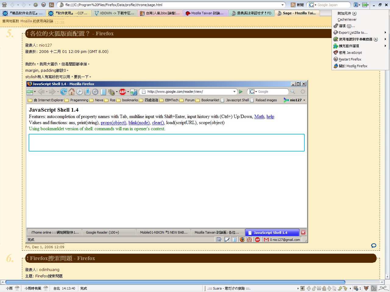 Mozilla/5.0 (Windows; U; Windows NT 5.1; zh-TW; rv:1.8.1) Gecko/20061024 BonEcho/2.0 (pigfoot)