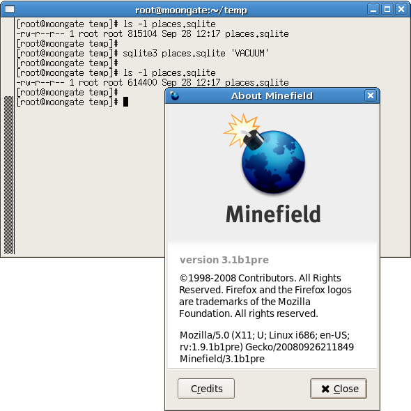 我自己因為怕弄壞它,當初是在關閉 Firefox 的情況下,複製一份到別處(假定A),然後開啟 Firefox 對 A 操作 Compact,之後關閉 Firefox 再複製一份到別處(假定B),將經過 Compact 的 A 蓋掉原來的 places.sqlite,開啟 Firefox 看是否正常,如果正常那就可以砍掉 A 及 B,如果不正常就用 B 來回復。
