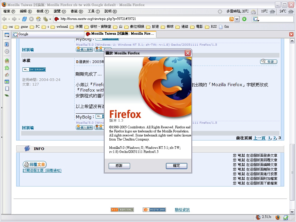 Mozilla/5.0 (Windows; U; Windows NT 5.1; zh-TW; rv:1.8) Gecko/20051111 Firefox/1.5