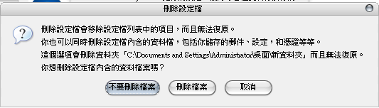 我自已試了一下, 先新增一個新資料夾, 再新增一個使用者放在新資料夾下, 再用profile manager刪除它, 結果會出現: ![]() 點「刪除檔案」後連新資料夾都會刪除, 如果你是這個問題的話可能所有的檔案都被刪除了! 我這邊有兩個急救的軟體 Smart NTFS Recovery Smart FAT Recovery 這是最後的招術 呃...我就是設定我的文件,莫非因此被清空 >_< 嗚嗚... 感謝大大,我救救看。 |