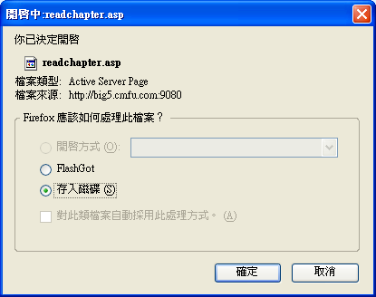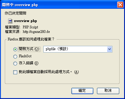 最近用FF開asp和php時,有時FF會彈一個視窗問我要不要下載,像是打開zip、rar一類檔時。(看圖)