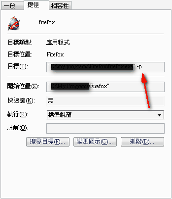 就是下面圖紅色箭頭指的東西 你必須在firefox不啟動的狀況下 執行那個捷徑 在有firefox視窗按下捷徑也只是另外開一個視窗罷了