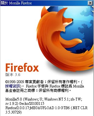 Mozilla/5.0 (Windows; U; Windows NT 5.1; zh-TW; rv:1.9.2) Gecko/20100115 Firefox/2.0.0.17;MEGAUPLOAD 1.0 GTB6 (.NET CLR 3.5.30729)