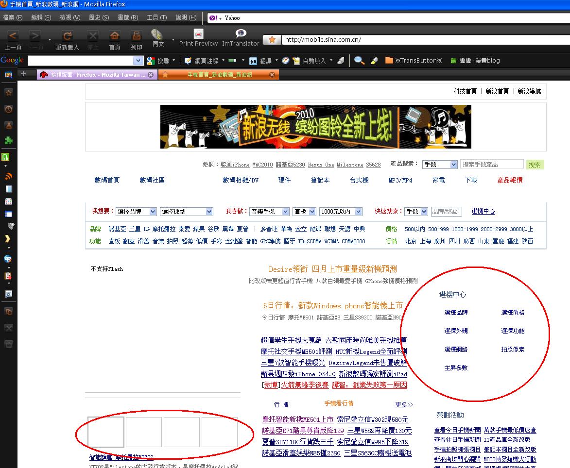求救各位版大, 我這個阿呆已經爬文很久可一直找不到解答, 可否請厲害的版大教教我, 大感恩!! 因工作原因需要常瀏覽"北京新浪網"http://www.sina.com.cn/的科技新聞, 可是用FF 3.6.3瀏覽該網站, 沒有一個圖片是可以正常顯示的(請參考附圖1&2), 圖片只會顯示成大方框或小方框或不顯示, 重新安裝過Java & flash (Java:6.0.190.4版, Flash:10,0,45,2版) 仍無法改善, 爬文後新增stylish (copy其他版大的方法)同樣不顯示....真的是欲哭無淚... 曾求助台灣新浪客服仍無法解決(客服回覆客:服人員初步判定的狀況仍然和網頁flash等設定上有相關, 但由於新浪網站各分公司的主機伺服器,會員等資料服務皆為分開,故建議您可以進一步向北京新浪客服人員詢問細節) 版大, 拜託教教我吧, 謝謝。