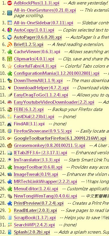 coolcd 寫: 試試看安全模式是否可正常顯示 如果可以,代表問題可能與 extensions 有關 以安全模式停用所有的附件仍無法正常顯示 (FF會顯示外掛程式訊息, 如圖1).... 另附上我的擴充套件清單 我知道....套件太多....可是...每個都是我需要用到的... 說實話, 是真的有幾個套件真的是沒用到 (ex. WebDeveloper....) 有沒有可能與是:功能列上的工具\選項\應用程式內的設定有關?? (如圖)