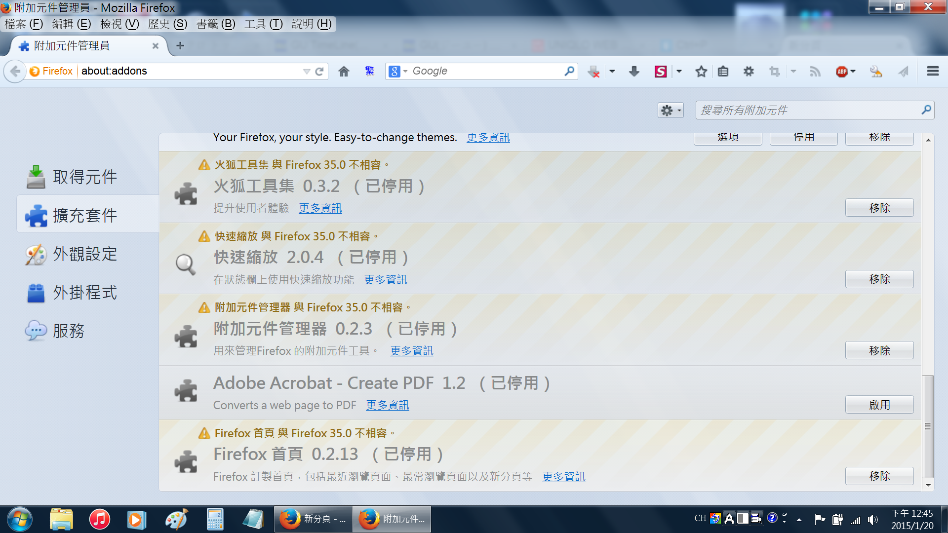 Irvin 寫: sonic10th1991 寫: 剛註冊帳號,如果提問的內容有違反版規請告知我,我會刪除改進的>_< 以下是我的疑問: 今天剛從FIREFOX台灣版更新到35版 結果愛用的台灣版九宮格附加原件停用了(震驚且著急) 請問原本存在九宮格內的網址救得回來嗎? 有幾個網址並沒有經常閱覽,但緊急時點擊就能開啟頗有助益 現在在歷史紀錄裏也找不著這些連結存檔...(有經常刪掉歷史資料的習慣OTZ) 不得已才發問,想挖回這些連結...哀 九宮格功能很好用...希望FIREFOX新版能從善如流重新考慮支援這個元件~感謝 Hi, 你可以試試自己安裝台灣版套件,看能不能把 profile 中記錄的網址取回: http://moztw.org/firefox/tw/#fxtw-twhomepage 如果沒辦法,也可以直接從這個頁面上下載最後的舊版台灣版, 安裝蓋掉目前電腦中的 Firefox,再看看首頁連結會不會被救回來。 我剛剛完成以下的測試,獲得兩點結論,並成功找回連結 感謝管理員的指點*^_^* 1.以FIREFOX 35版直接安裝台灣版附加元件管理器0.2.2 結果是可以安裝,但無法讀取儲存的資料,只會顯示凌亂的版面 附加檔案: 2.以FIREFOX台灣版覆蓋35版,並直接開啟九宮格功能頁面 「可成功讀取自設的九宮格連結!!」 更新35版並停用元件並不會立即影響連結列表 但仍建議有相同困擾的網友早點去備份連結比較妥當 ◎晚間21:22補充: 當我備份完台灣版九宮格頁面連結(並且刪光連結後) 我重新安裝了FIREFOX 35版 當開啟網頁並多開一個新頁面時 我看到35版有九宮格頁面了...那我白天被驚嚇應該是靈異事件 有圖為證