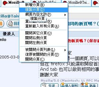 Mozilla/5.0 (Macintosh; U; PPC Mac OS X Mach-O; zh-TW; rv:1.7.6) Gecko/20050301 Firefox/1.0.1 (G4 Opt By AsIF.)