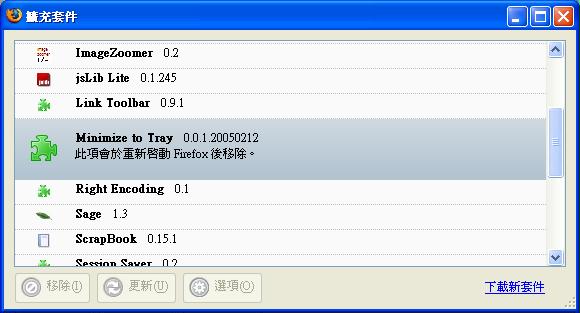 各位大哥....請幫幫忙 !! 每次只要我執行火狐就會出現錯訊息...!!請看下圖:SNAG-032.JPG 我認為是minimize to tray 這個擴充套件的問題 , 因此 , 我到擴充套件裡去刪除此項套件 , 卻怎麼刪都刪不掉 ,即使重新執行火狐也無法去除 , 請看下圖:SNAG-031JPG 不知道各位大哥有無辦法~~請救救我的火狐吧~~