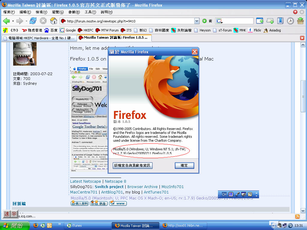 Mozilla/5.0 (Windows; U; Windows NT 5.1; zh-TW; rv:1.7.9) Gecko/20050711 Firefox/1.0.5