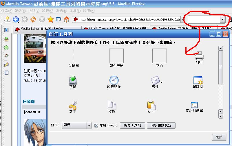 檔案註釋: 不知是我的firefox有問題還是firefox1.06有問題,那些圖示/按鈕總是不能drag進"自訂工具列"....