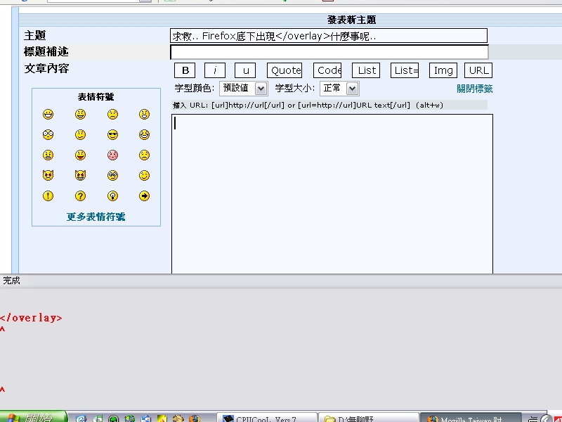 | 文章主題 : | 求救.. Firefox底下出現</overlay>什麼事呢.. | ||