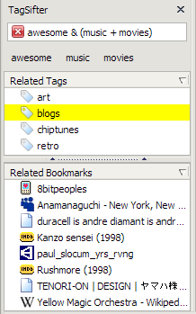 側邊欄上方窗格是一堆 tags (可選擇用清單的方式顯示或 Cloud 的方式顯示),下方是與上方選取的 tag 相關的書籤,側邊欄頂部有一條搜尋欄,可輸入 tag 名稱,搜尋相關的書籤,不僅支援自動完成(輸入 tag 時,只要輸入 tag 中部分文字,就可自動顯示 tag 的完整名稱),還支援條件式的搜尋,舉例來說,「AA - (BB + CC)」代表要搜尋有加上 AA 標籤,但沒有被加上 BB、也沒有被加上 CC 標籤的書籤。