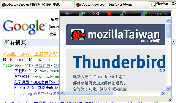 Cooliris Previews 給你瀏覽的力量、分享連結和更快更肥沃的多媒體(人工直譯,這句話實在挺神奇的,有人可以幫我翻譯嗎?)。只要滑鼠滑過任何連結,Cooliris 的預覽視窗立即會出現連結的內容。如果要mail這個連結,點一下就OK了!