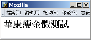 <head> <meta http-equiv="Content-Type" content="text/html; charset=Big5" /> <style type="text/css"> body { font-family: "華康瘦金體", DFSoZing-B5, "華康瘦金體 Std W3", "DFSoZing Std W3"; } </style> </head> <body> <h1>華康瘦金體測試</h1> </body> </html> 網頁在 http://www.imacat.idv.tw/home/sozing.html 我的兩個瘦金體字型分別是 DFFT_Z3.TTC 華康瘦金體 & 華康瘦金體(P) Typeface 名稱:華康瘦金體 檔案大小: 11246 KB 版本: 1 Dec., 1996: Version 2.00 (c) Copyright DynaLab Inc. 1992-1997 DFSoZingStd-W3.otf DFSoZing Std W3 OpenType Fonts, PostScript Outlines, Single Master Typeface 名稱:華康瘦金體 Std W3 檔案大小: 13715 KB 版本: Version 1.03 (c) Copyright 1994-2003 DynaComware Corp. All rights reserved. 如果有人能夠在 Mozilla 下看得到華康瘦金體 能夠把實際看到的畫面貼上來,並告知所用的華康瘦金體的版本、日期等等資訊 我會非常感謝~