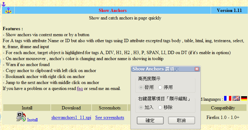 套件功能: 在右鍵選單加入「顯示錨點」項目(可在選項調整是否加入)。顯示後,錨點處會出現一個錨點的小圖示,在圖示上按滑鼠左鍵可複製錨點網址、按中鍵可跳到下一個錨點、按右鍵可將該網址加入書籤。