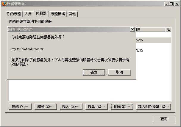 伺服器誤植成伺服『氣』 另外『伺服器例外』感覺怪怪的,因為沒看到原文,不過如果翻成 『例外伺服器憑證』是否會好些? 伺服氣已修正。 「伺服器例外」改成「例外伺服器」 |