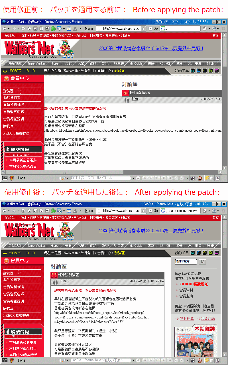 Firefox 1.5.0.5 NoSSE(2006070902), Firefox 1.5.0.5(2006070822) - new patch (Bug 255990/patch 227210) applied.