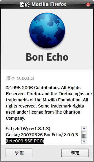 Mozilla/5.0 (Windows; U; Windows NT 5.1; zh-TW; rv:1.8.1.3) Gecko/20070326 BonEcho/2.0.0.3 (tete009 SSE PGO)