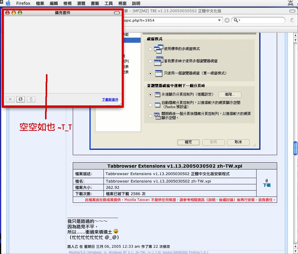 Mozilla/5.0 (Macintosh; U; PPC Mac OS X Mach-O; zh-TW; rv:1.7.5) Gecko/20041119 Firefox/1.0