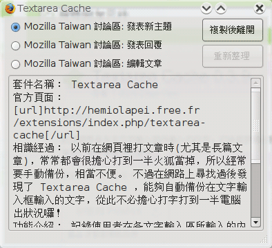 官方頁面: http://hemiolapei.free.fr/extensions/index.php/textarea-cache