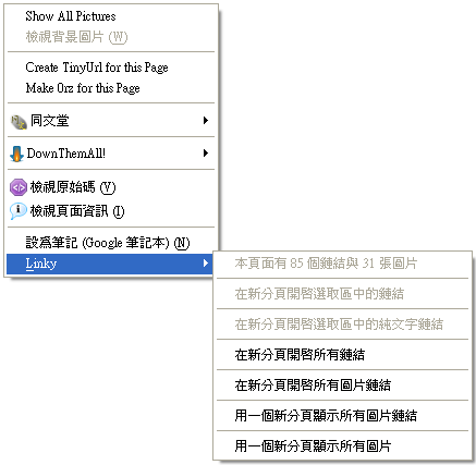 檔案註釋: 按下『在新分頁開啟所有連結』,會彈出對話框顯示目前頁面中的所有鏈結,還可以把它們都複製到剪貼簿唷~