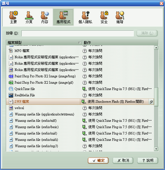 問個傻問題,為什麼您選項的應用程式分頁,會跑出 SWF 檔案這項呢?小弟的 Fx 從來沒出現過那個設定喔~