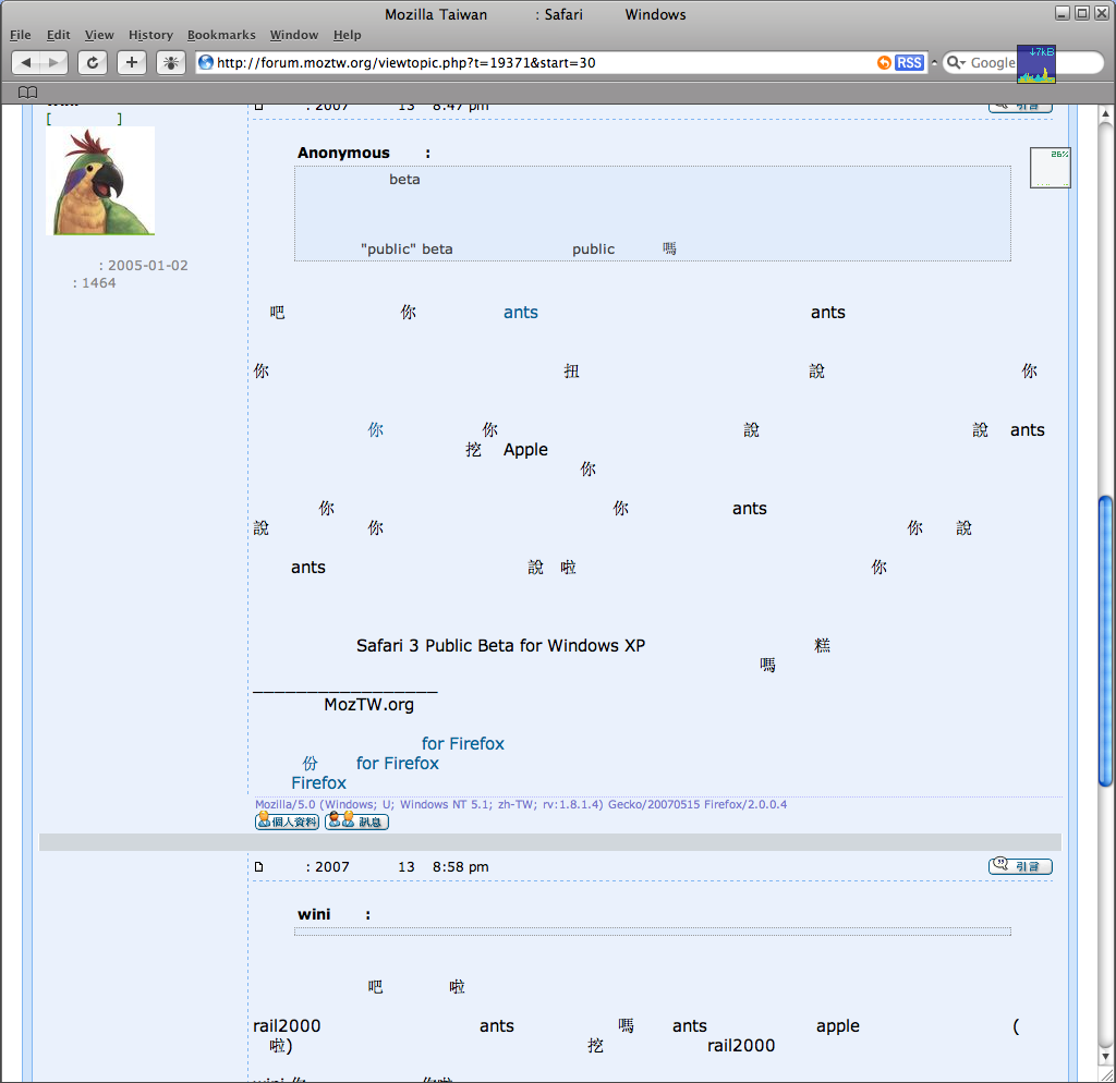 回正題,雖然 Safari 3 Public Beta for Windows XP 在中文環境下的確很糟糕,不過在其他語系下又是怎樣就不得而知了。不知道有沒有誰測試過在英文語系環境時的穩定程度了嗎?
