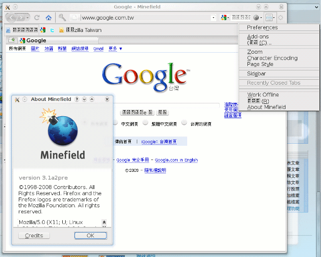 Mozilla/5.0 (X11; U; Linux x86_64; zh-TW; rv:1.9.1a2pre) Gecko/20080822233502 Minefield/3.1a2pre