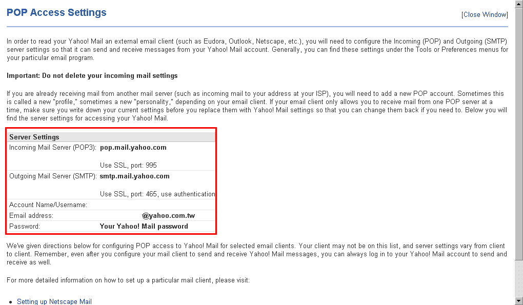 Incoming Mail Server (POP3): pop.mail.yahoo.com.tw Use SSL, port: 995 Outgoing Mail Server (SMTP): smtp.mail.yahoo.com.tw Use SSL, port: 465, use authentication Account Name/Username: <您的帳號> Email address:<您的帳號>@yahoo.com.tw Password:Your Yahoo! Mail password 12. 試試看能不能把郵件收下來吧 XD |