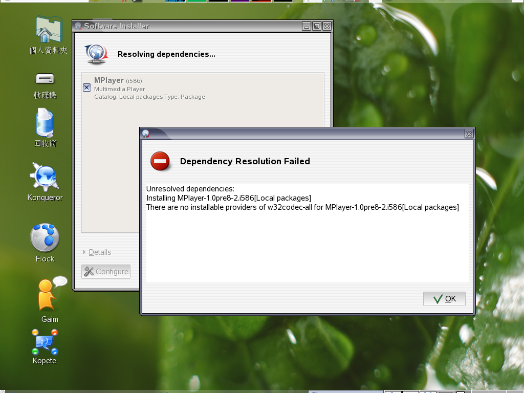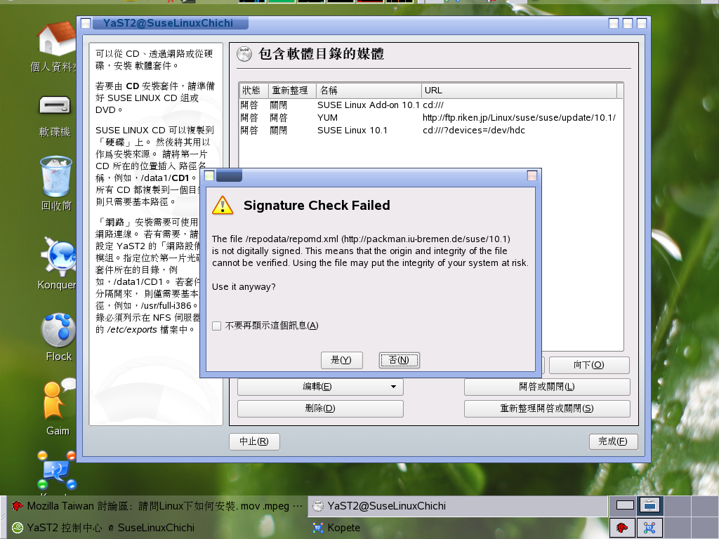 恩,有試著安裝MPlayer-1.0pre8-2.i586.rpm(for Suse 10.1 i586),安裝警示訊息如下圖所示