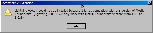 Lightning 0.0.1+ could not be installed because it is not compatible with this version of Mozilla Thunderbird. (Lightning 0.0.1+ will only work with Mozilla Thunderbird version from 1.0+ to 1.6a1 )