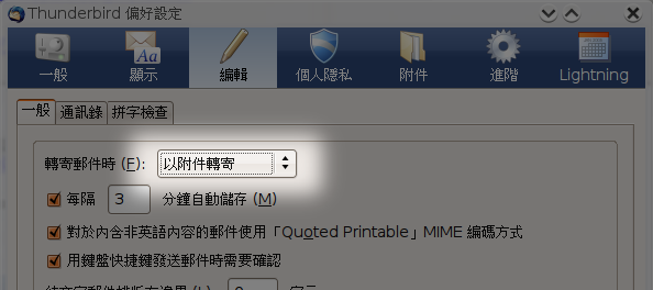 所有不見的圖通通被替代成上面那張了,看起來應該是 Hotmail 認為 Thunderbird 的原始郵件裡的圖有安全疑慮所以全抽掉了。 這應該是跟 Hotmail 的安全機制有關。 由於我試過即使把 Thunderbird 信件裡除了圖片以外的東西全部拿掉還是一樣,但是要是直接開一封空白信插圖又不會有問題。 所以我認為可能是 Thunderbird 在轉寄信件時的夾檔方式被 Hotmail 認為不安全所致。 其實這個問題似乎在 mozillaZine 上也有被提出來討論過,不過到現在好像也是無解。 我自己是有發現一個比較可行的辦法,那就是把轉寄方式改成夾帶的方式,雖然我個人比較不推崇這種轉寄法,但這樣確實能解決這個問題,所以就先將就著用吧...