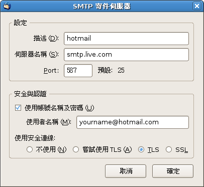 檔案註釋: 設定 Thunderbird 配置 hotmail SMTP 寄件伺服器