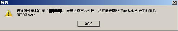"過濾郵件至郵件匣「ABC」後無法變更收件匣。您可能要闗閉 Thunderbird 後手動刪除 INBOX.msf。"