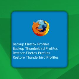 yahoo!widget的小工具:"Firefox and Thunderbird Profile Backup" 簡單明瞭~只要先設定備份儲存定後, 備份加還原Firefox 和 Thunderbird的重要資料,一鍵搞定! 下載網址:http://widgets.yahoo.com/widgets/firefox-and-thunderbird-profile-backup 希望對你有幫助!
