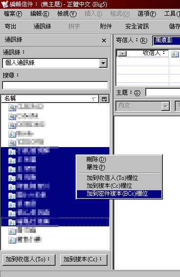 可以啊~將通訊錄中要寄的名單點選後,按右鍵就有可以選擇用全部密件副本了 |